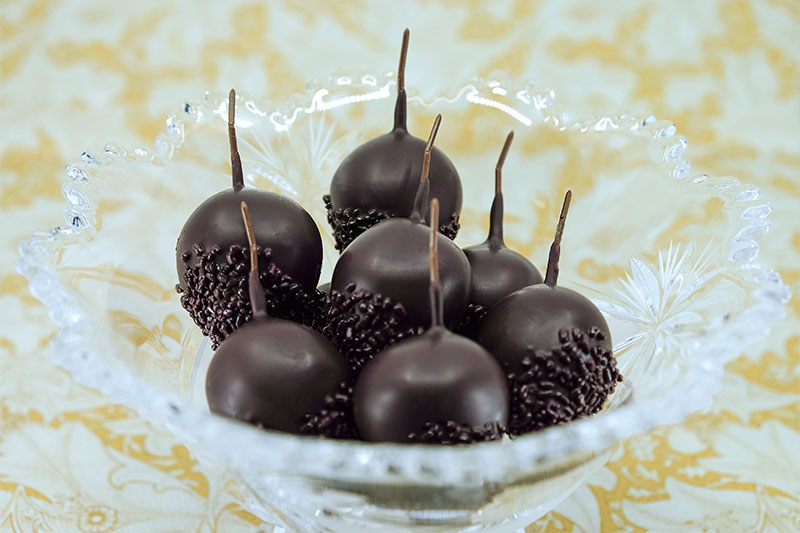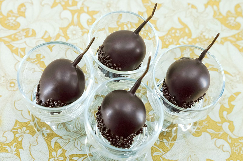 16 Armagnac-fylte moreller, dekket med mørk sjokolade.